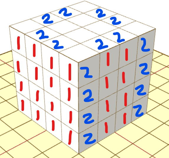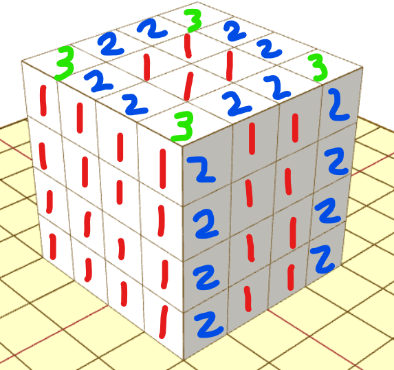 결국에는 하나의 모서리를 공유하는 세 면을 구성할 수 있는 경우의 수 중에서 가장 낮은 수 3개인 경우를 찾아서 위와 같이 배치하게 되면 최솟값이 될 것이라고 생각했다. 실제로 $2^3$ 정육면체에서는 해당 경우가 가능했다.